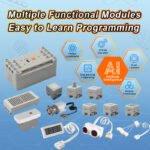 This kit features small particle blocks to build 25+ models and includes 16 lessons. The set integreates multiple sensors, providing oppotunities for children to explore advanced programming tasks. It is ideal for children with prior experience in building blocks who want to challenge themselves with more complex programming.