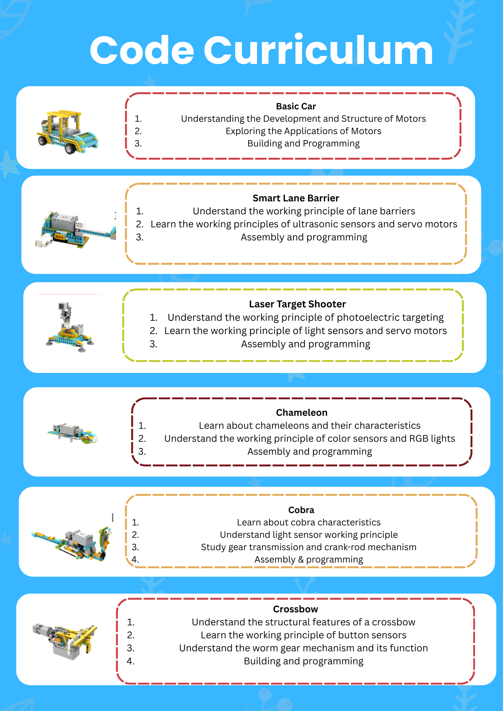 The kit includes building blocks for constructing 18+ models, along with 16 lessons per session. It is designed to teach children mechanical principles and programming logic through engaging activities. Using physical cards to program robots, children can perform specific tasks and actions, helping them to learn problem-solving skills and real-world applications of programming.